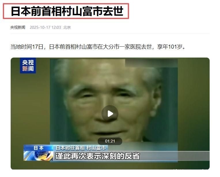 10月17日,国内多家权威媒体发布消息:日本前首相村山富市辞世,终年101岁。这一年龄已属极为罕见的长寿,其一生可谓圆满落幕。他不仅是日本历史上服务国家多年的政治家,更是该国在世最年长的前任首相。