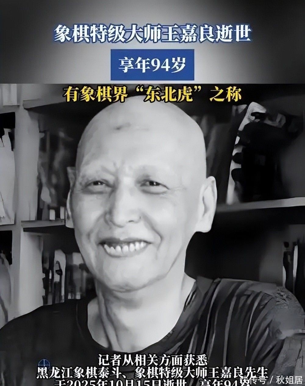 10月15日,中国象棋界传出令人悲痛的消息:黑龙江象棋泰斗、特级大师王嘉良先生因病逝世,享年94岁。