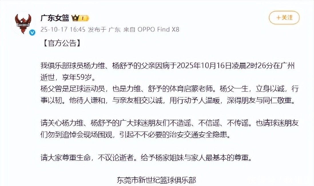 2025年10月16日,前中国男足国青队球员、同时也是女篮名将杨力维与杨舒予的父亲——杨飞鹏先生因病在广州不幸离世,终年59岁。